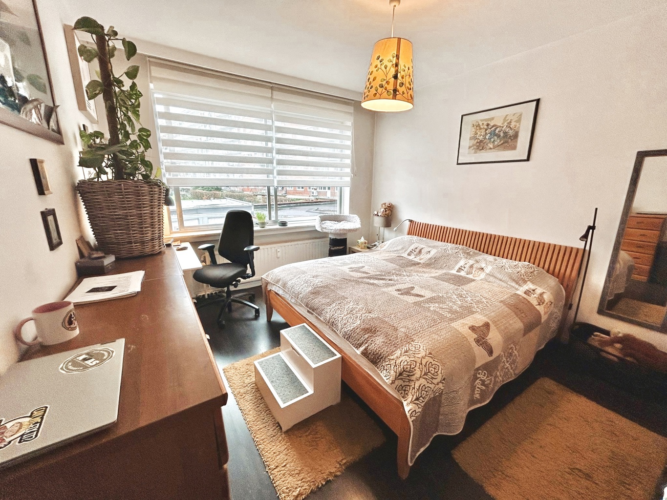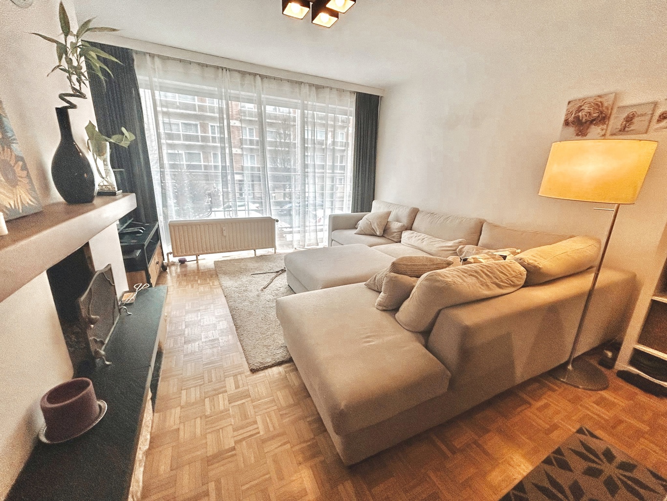 Situé au premier étage d'une petite copropriété, celui-ci se compose comme suit : hall d'entrée, spacieux living avec feu de bois intégré, cuisine, deux chambres, salle de bains, WC séparé et espaces de rangements. L'appartement comprend également une cave ainsi que deux terrasses.