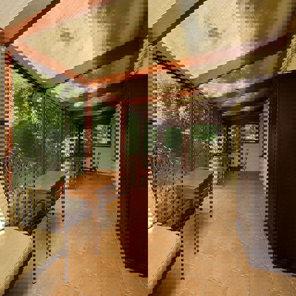 Inkomhal, woonkamer, eetkamer, semi-uitgeruste keuken, aangename veranda met directe toegang tot de mooie tuin, twee slaapkamers, badkamer, garage.