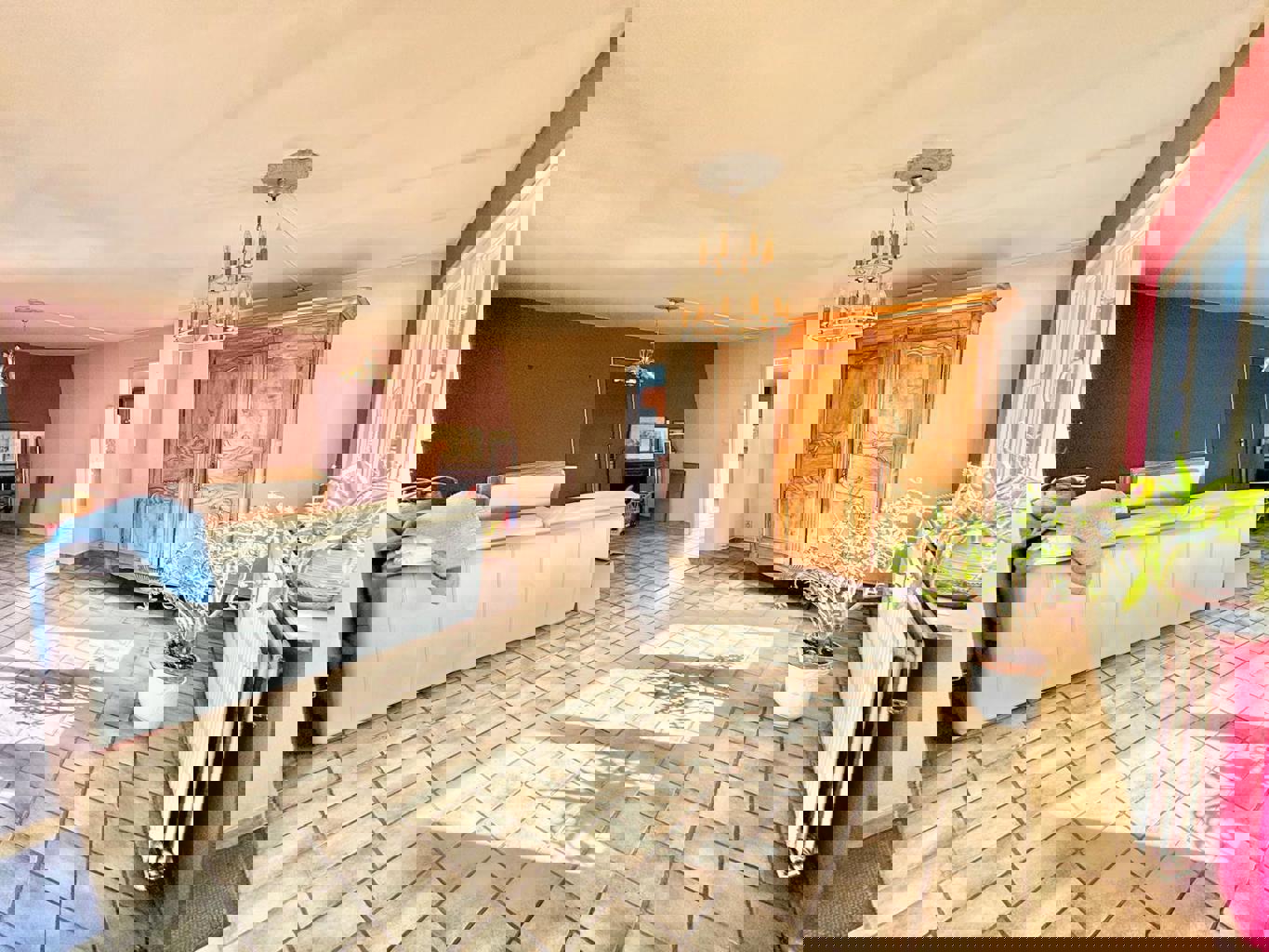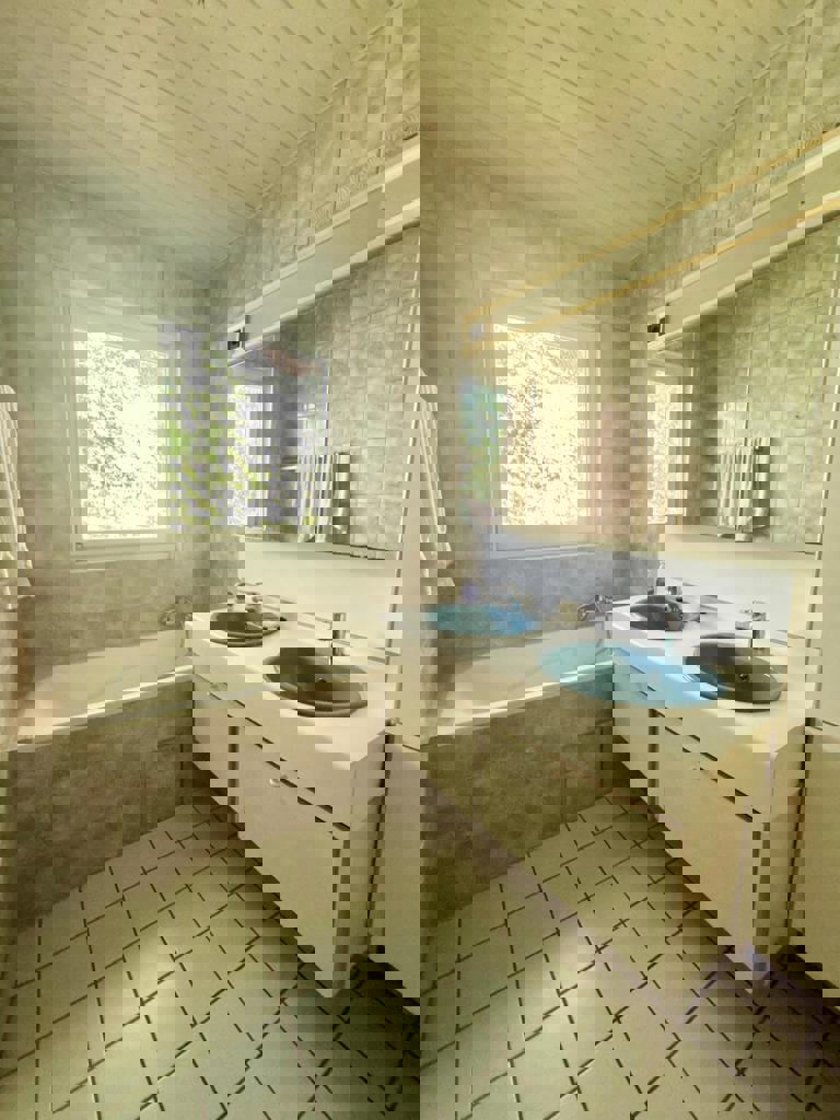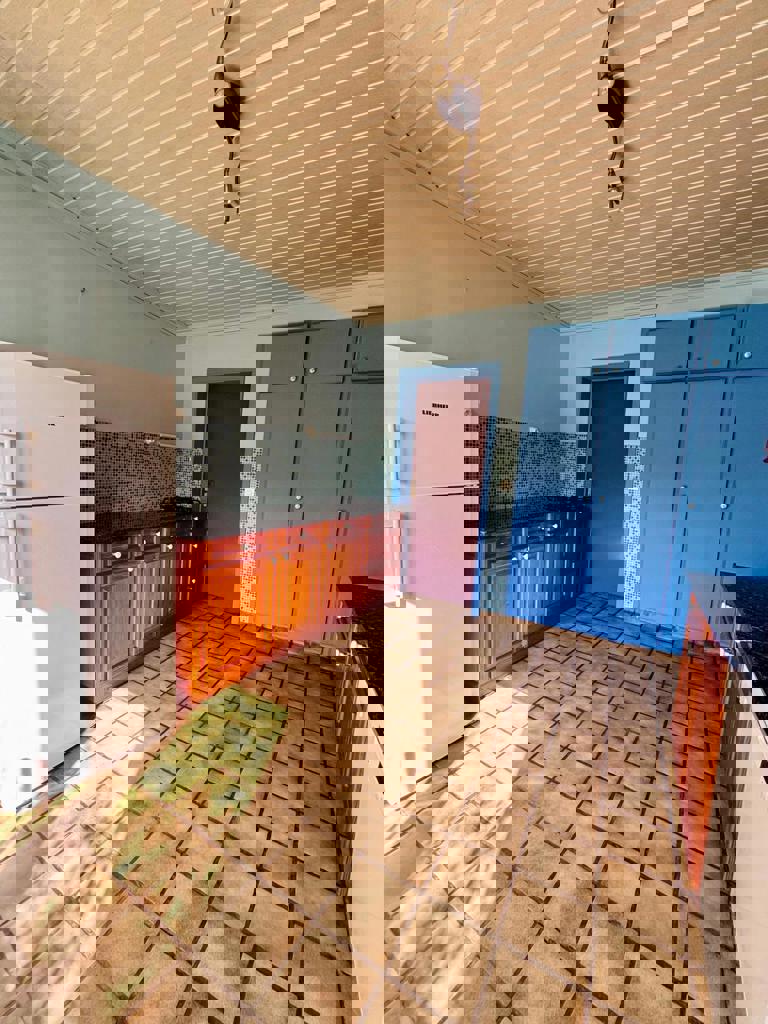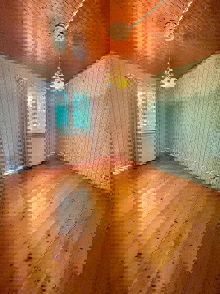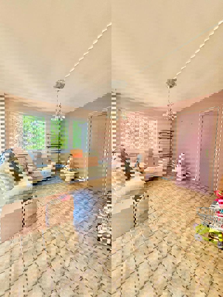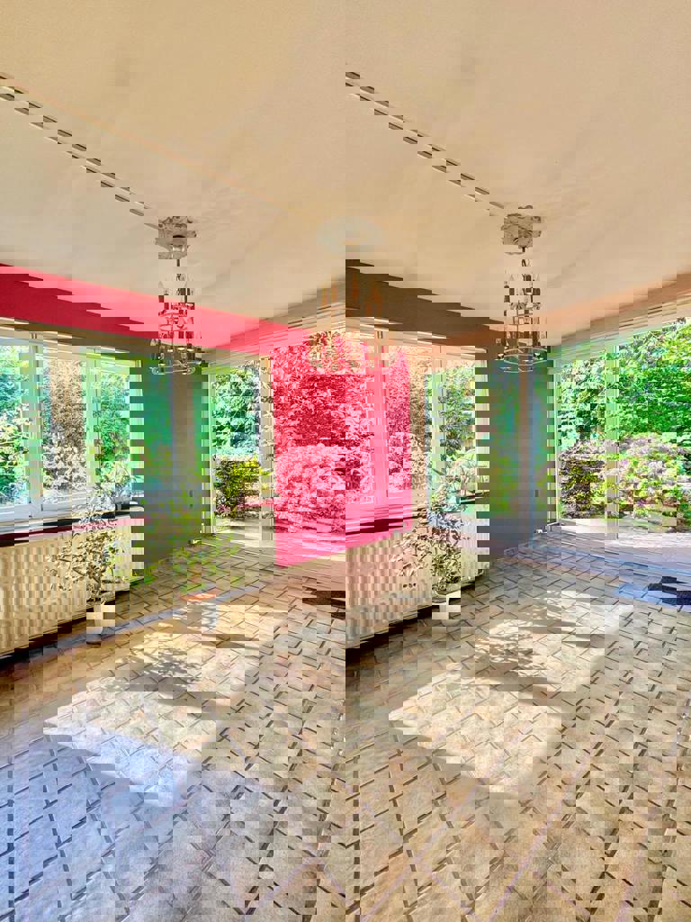 Inkomhal, woonkamer, eetkamer, semi-uitgeruste keuken, aangename veranda met directe toegang tot de mooie tuin, twee slaapkamers, badkamer, garage.