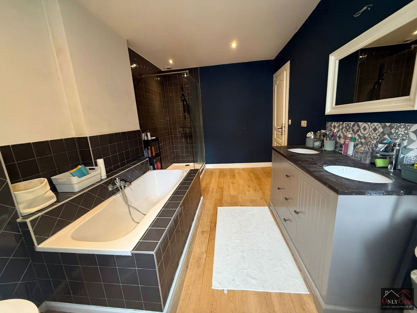 À l’étage, le hall de nuit dessert deux belles chambres ainsi qu’une salle de bains moderne équipée d’une douche, d’une baignoire et d’un WC.