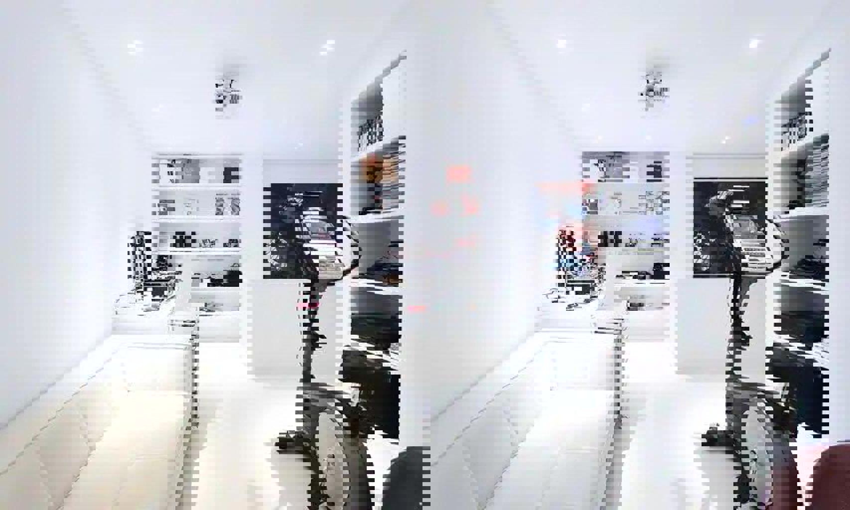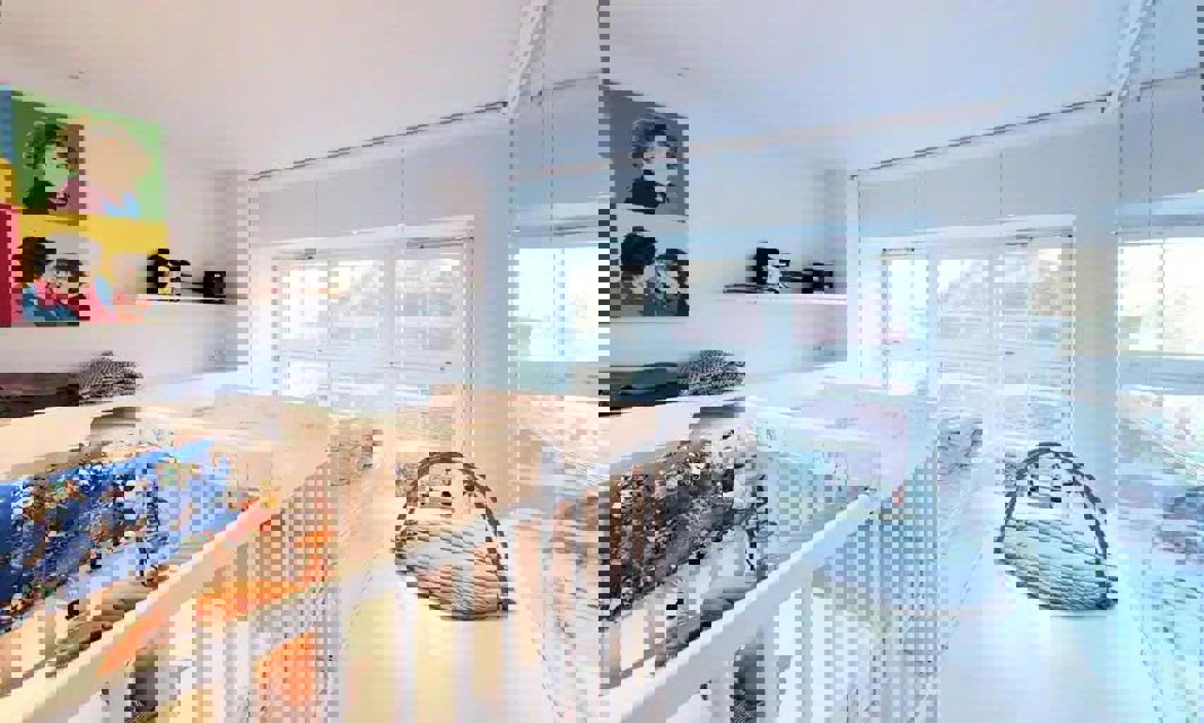 - À L'étage : 2 chambres, une salle de bain, un espace bureau et une salle de cinéma.